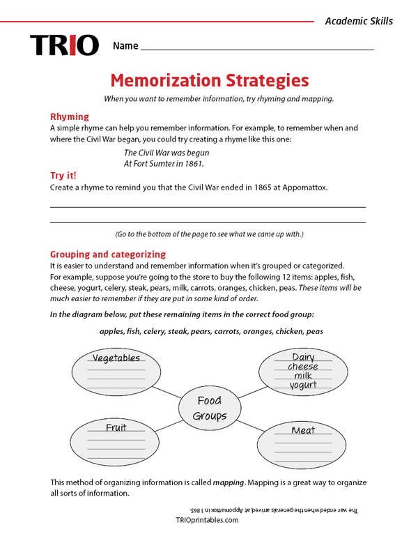 Improving Your Memorization Skills Activity Sheet – TRIO Printables