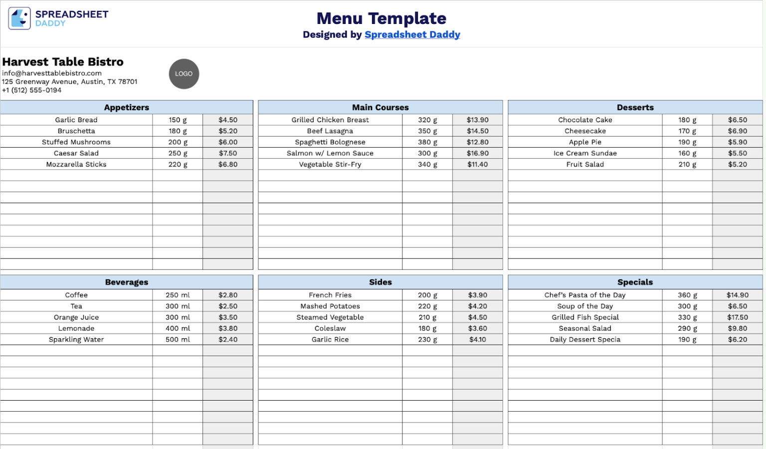 Free☝️ Menu Template (Google Sheets, Excel, & PDF Downloads)