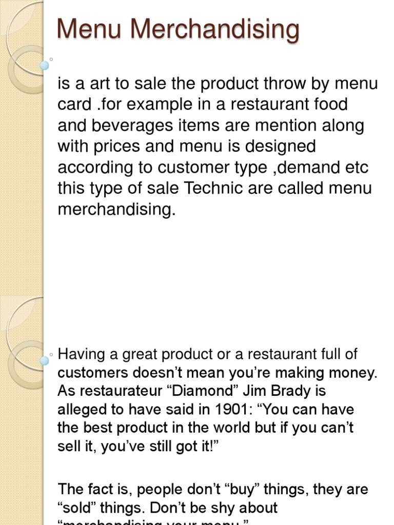 MENU MERCHANDISING:- It is an art to sale the product by menu card. For ...