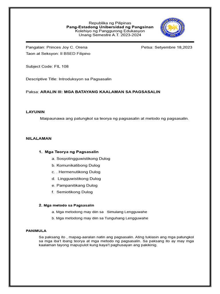 Introduksiyon sa Pagsasalin: Reviewer para sa Klaseng FIL101 - Studocu