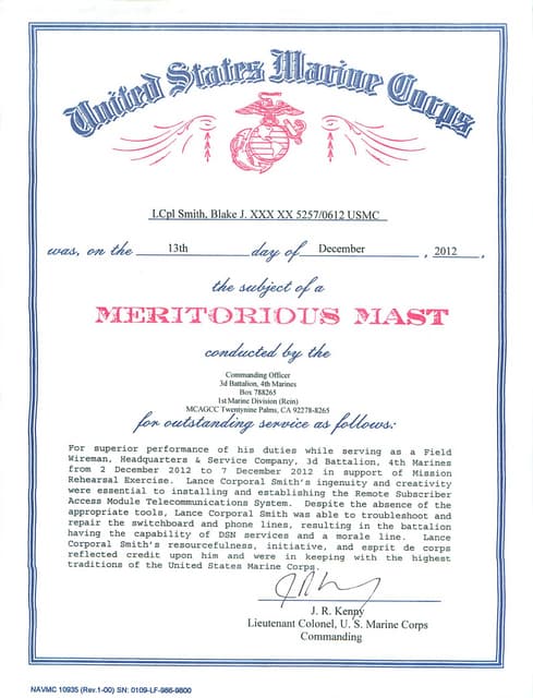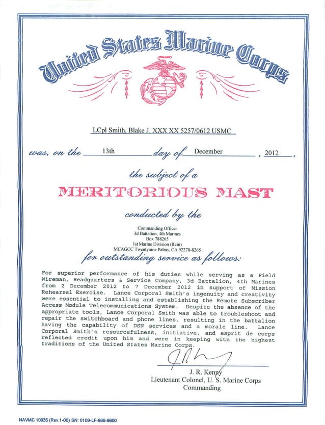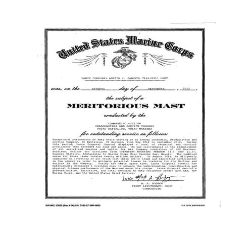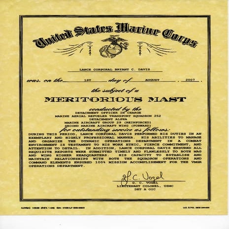 USMC Meritorious Mast certificate