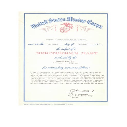 USMC Marine Meritorious Mast award certificate