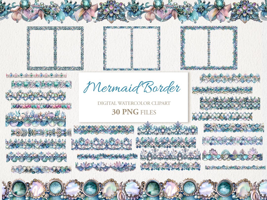 Mermaid Seamless Border Watercolor Clipart 35 PNG Bundle. AI ...