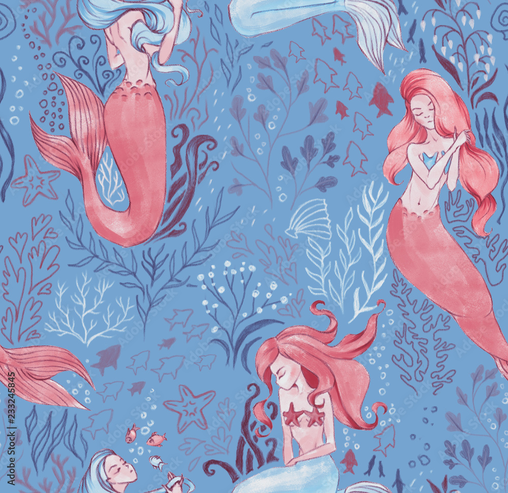 Seamless pattern with mermaids and marine life. Vector graphics ...