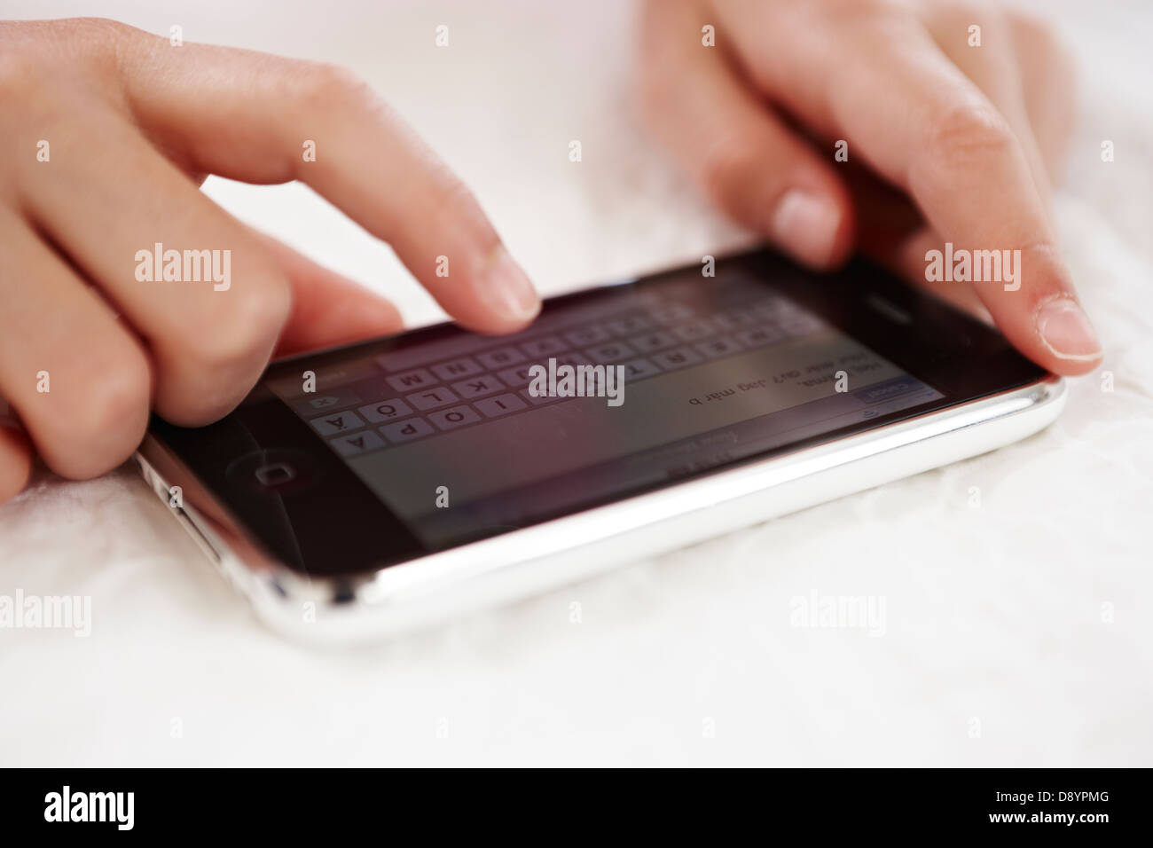 Typing a message from the close-up phone keyboard. Close-up of the ...