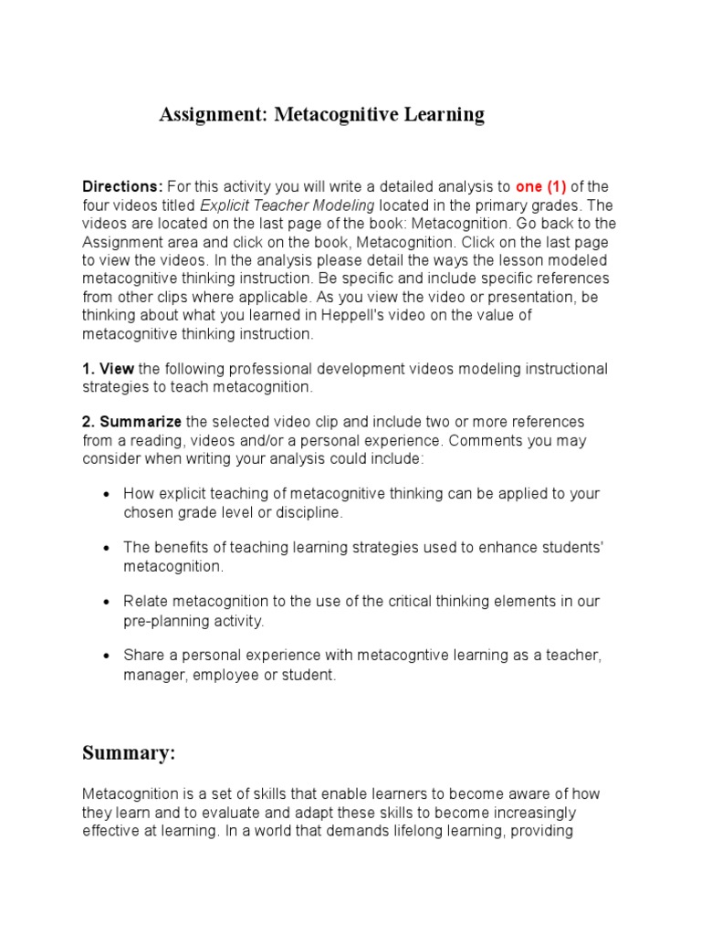 Metacognition learning assignment - Metacognition Learning Strategies ...