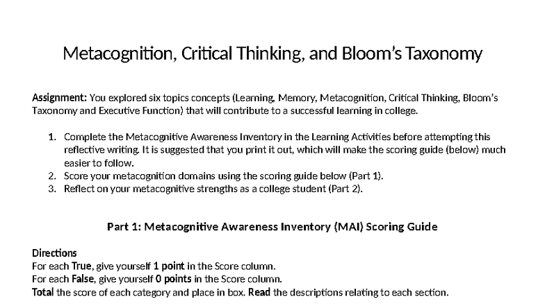 Metacognition and Critical Thinking Assignment (PSY 101) - Studocu