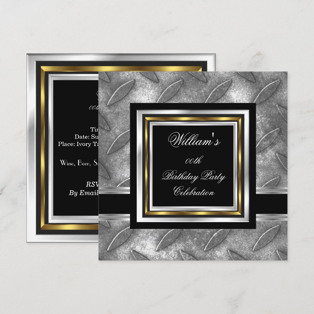 Men's Elegant Black Gold Silver Birthday Metal Invitation | Zazzle