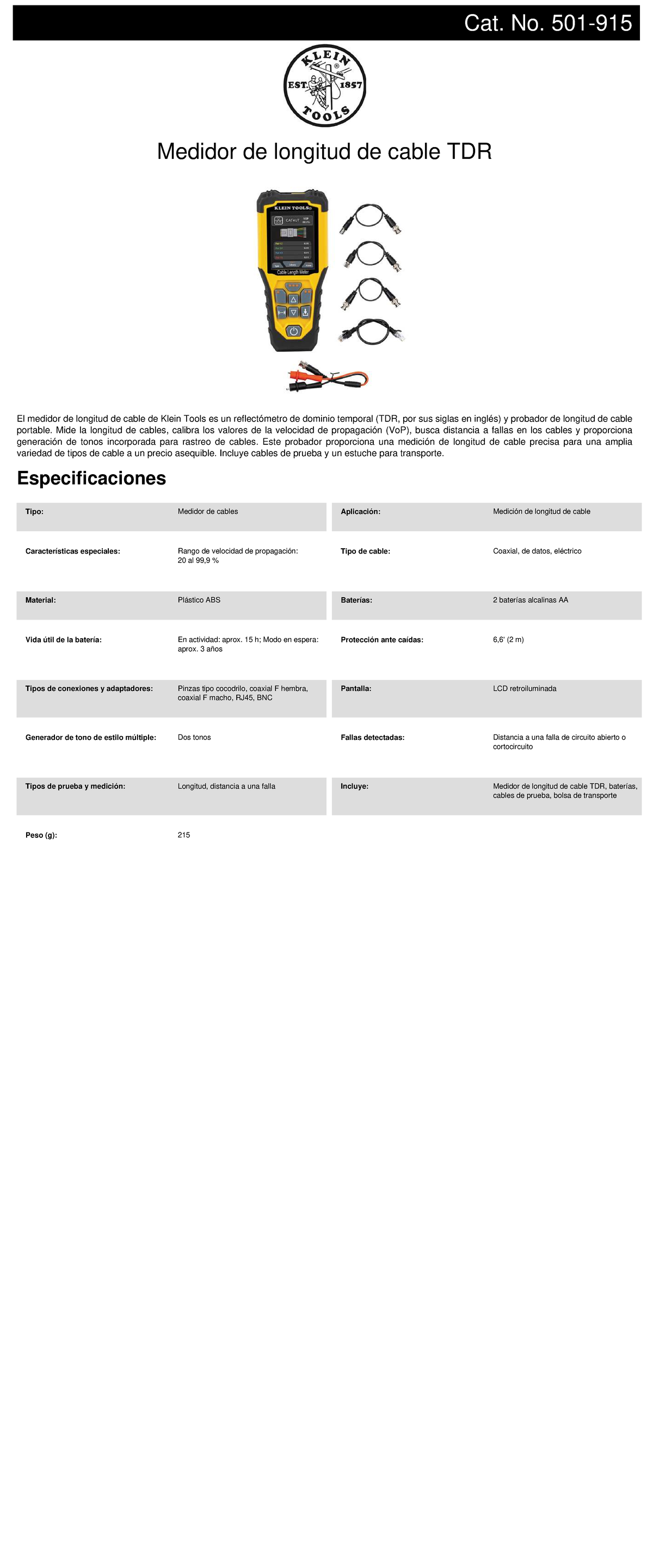 Datasheet for Klein Tools Cable Length Meter TDR (Cat. No. 501915 ...
