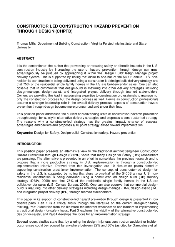 (PDF) Constructor Led Construction Hazard Prevention Through Design