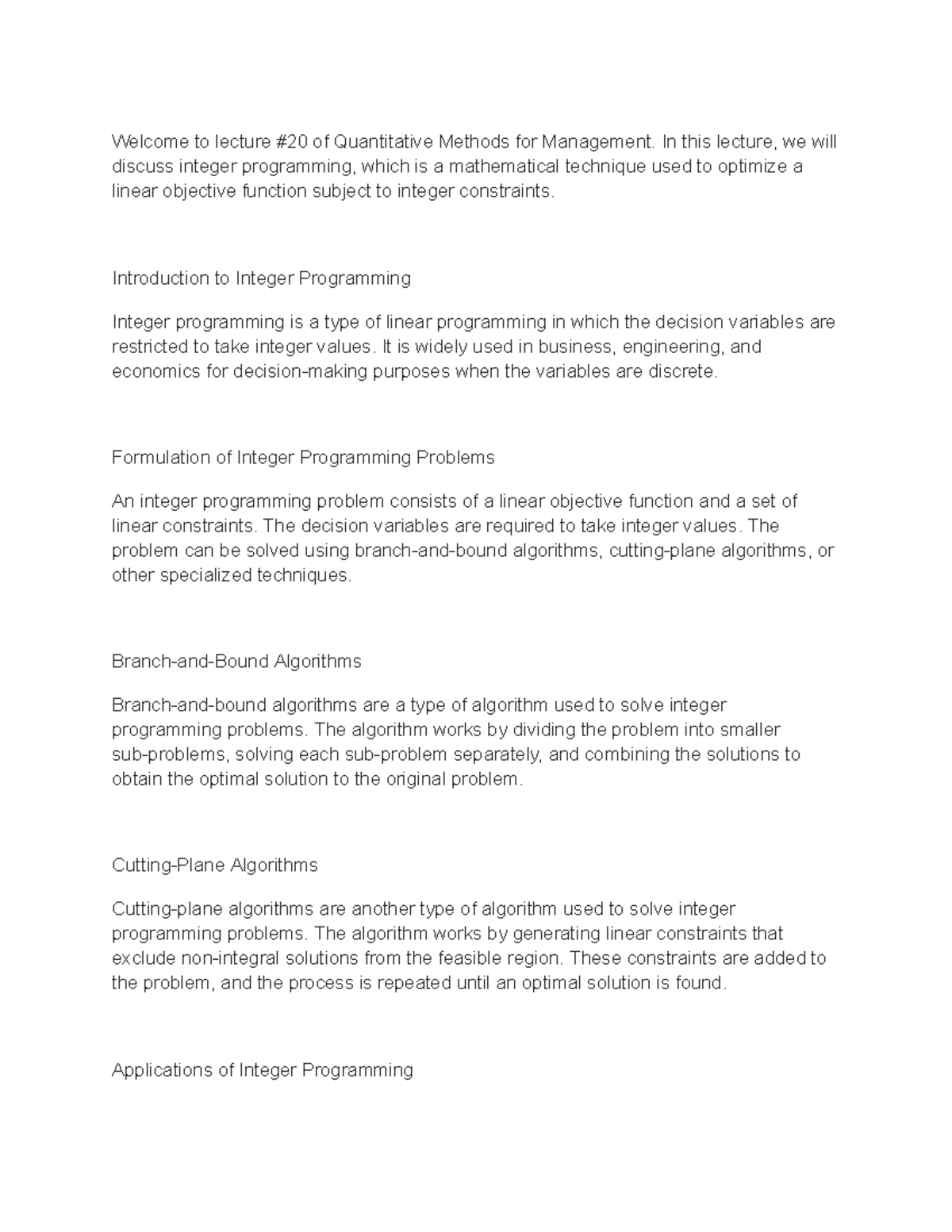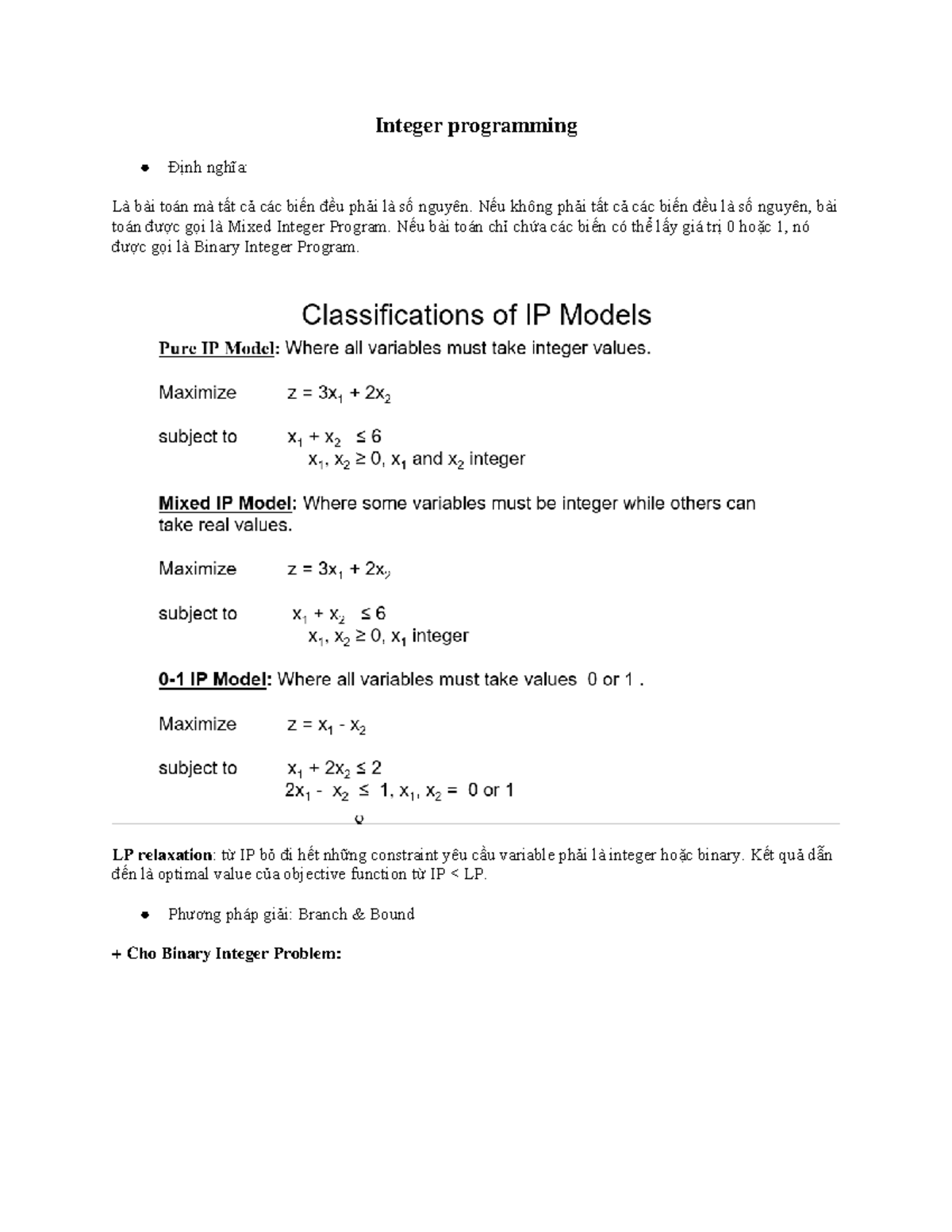 Integer Programming: Mixed & Binary Methods - Tlieu - Studocu