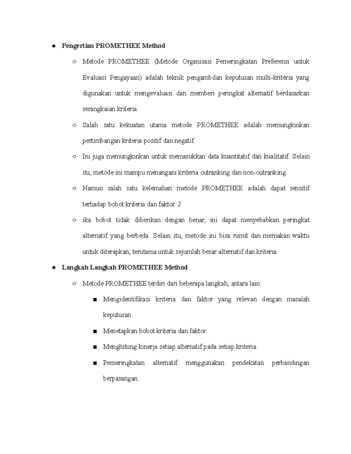 Metode PROMETHEE: Evaluasi dan Peringkat Alternatif Kriteria - Studocu