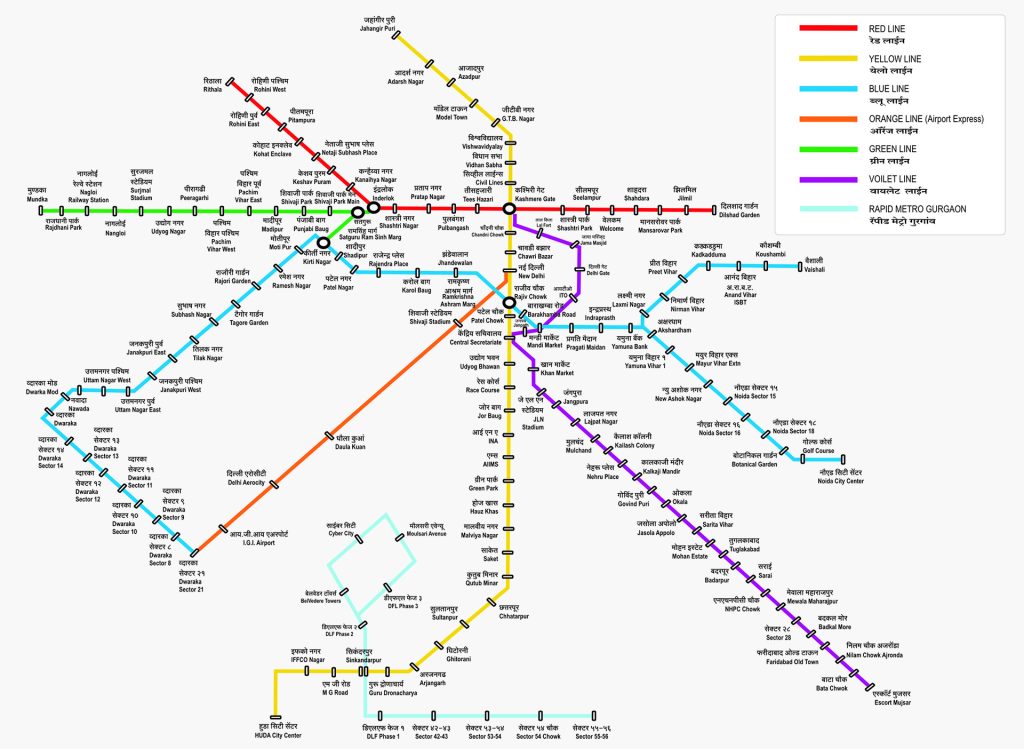 Delhi Metro Map and Route of Orange, Red, Green, Violet, Blue and ...