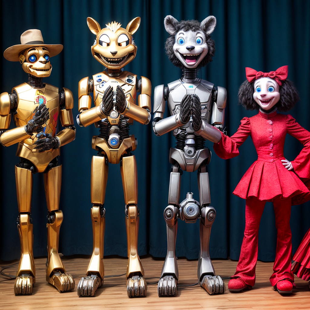 Three animatronic figures, including a sun-faced robot, a lion in a top ...