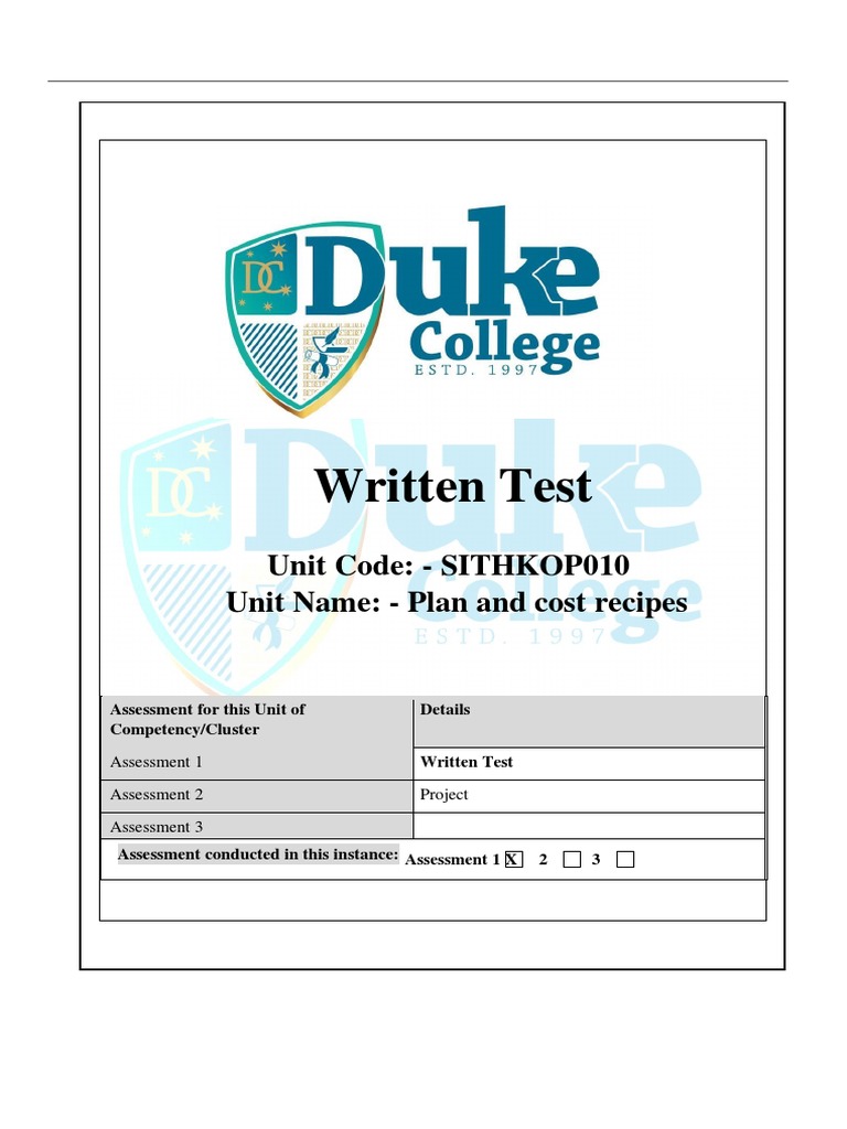 Written Test: Unit Code: - SITHKOP010 Unit Name: - Plan and Cost ...