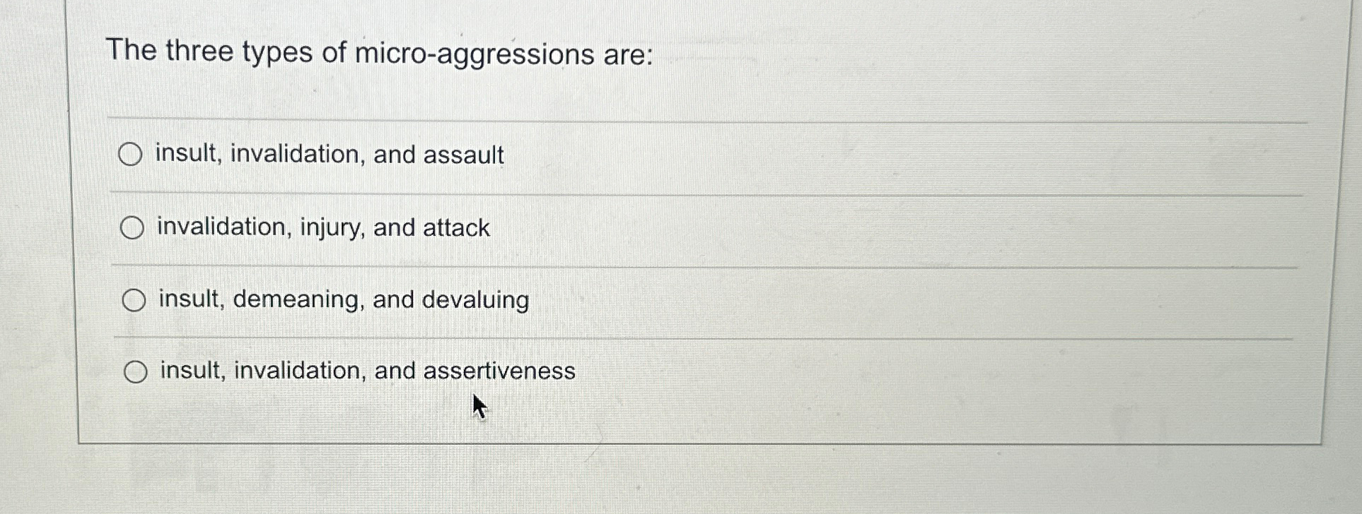 Solved The three types of micro-aggressions are:insult, | Chegg.com