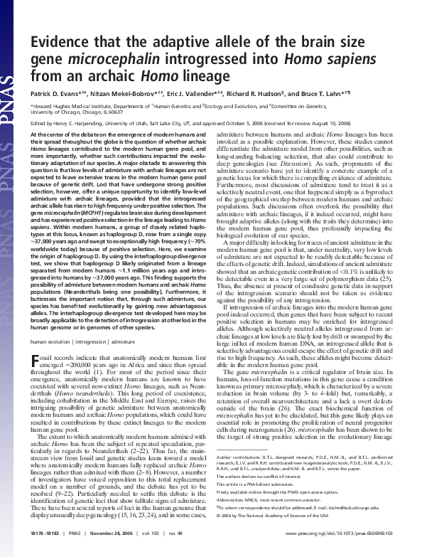 (PDF) Evans PD, Mekel-Brown N, Vallender EJ, Hudson RR, Lahn BT ...