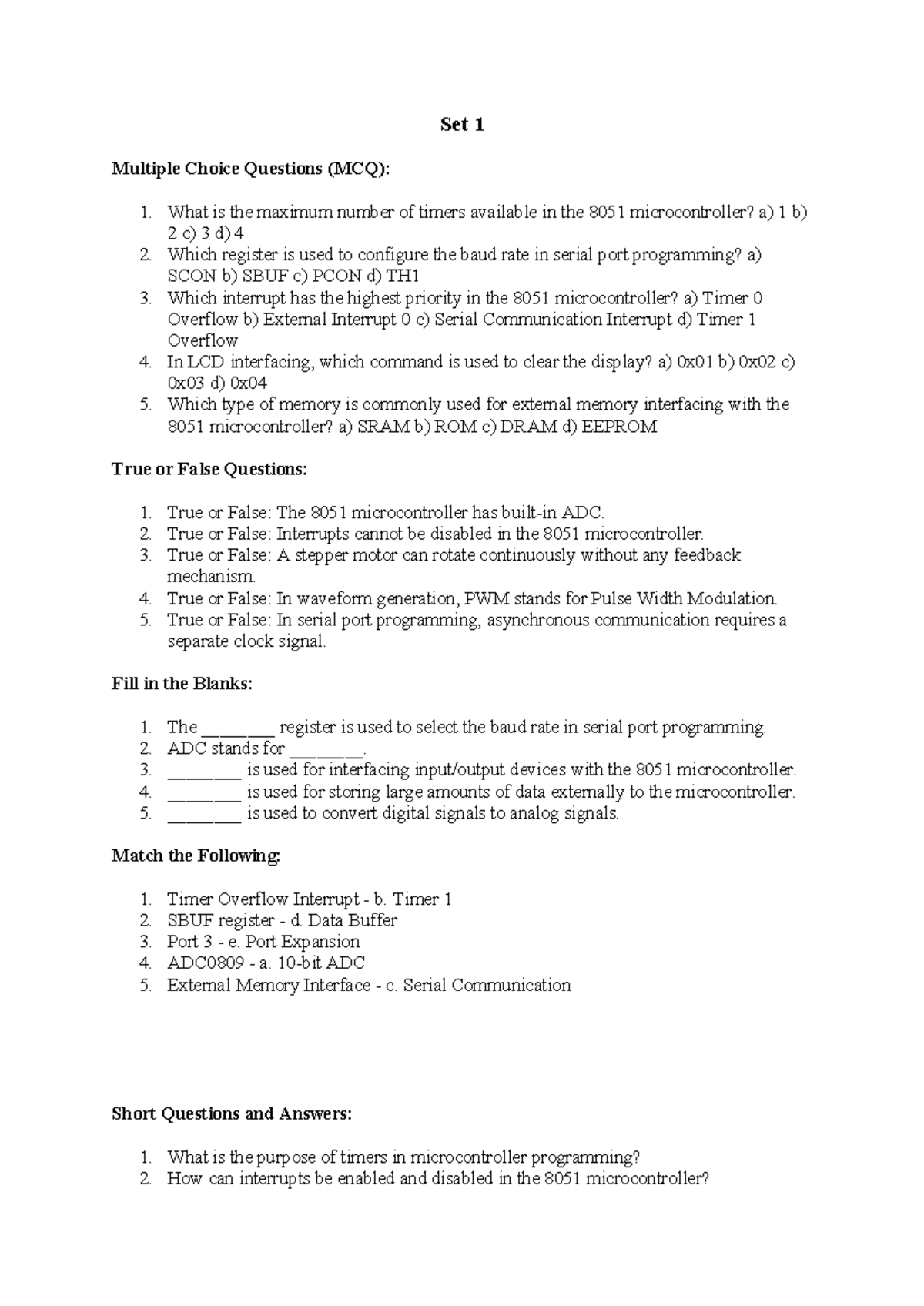 Interfacing, Serial Communication of 8051 Microcontroller (MCQ/Short ...
