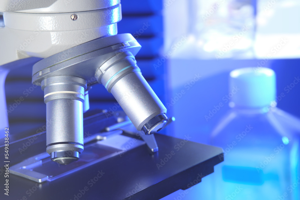 Microscope in laboratory science closeup research. Laboratory of ...