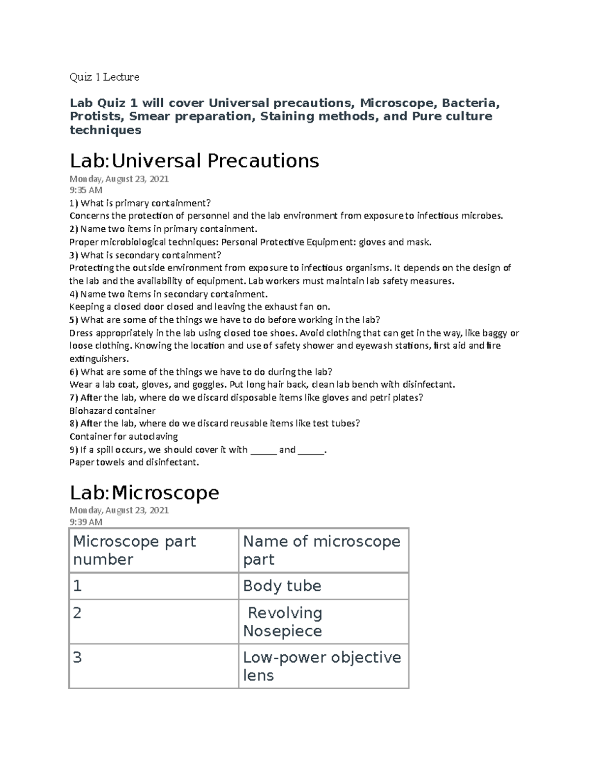 Quiz 1 Lecture - universal precautions, microscope, bacteria, protists ...