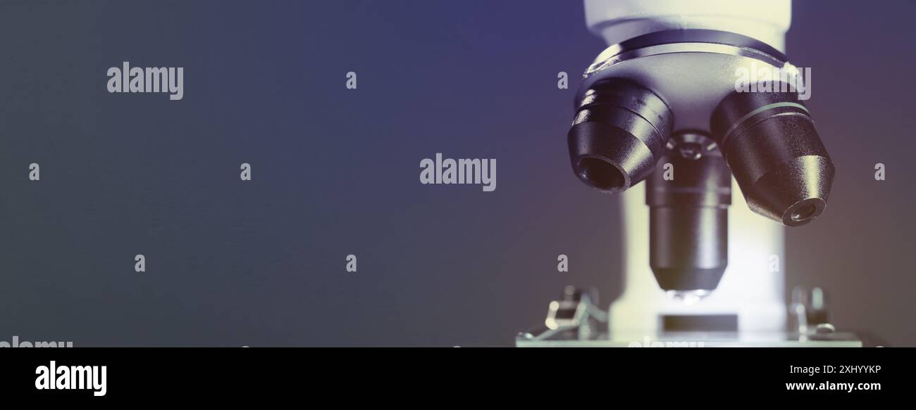 Realistic gray microscope. 3D rendering. Icon on blue background, text ...