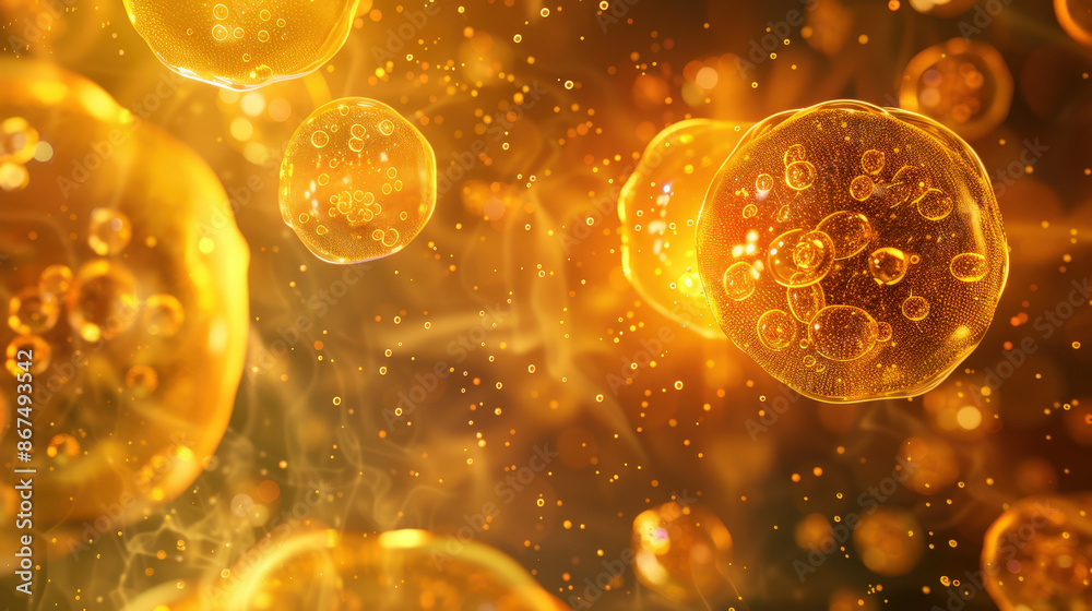 Microscopic image of golden exosomes in a translucent fluid, photo ...