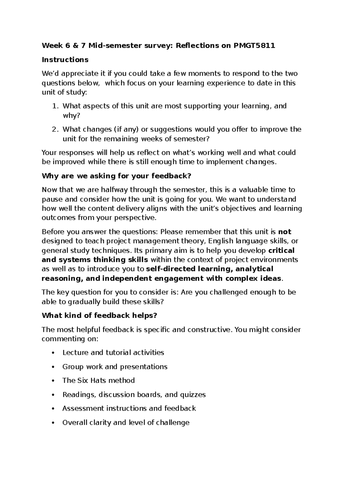 PMGT5811 Mid-Semester Survey: Reflections on Learning Experience - Studocu