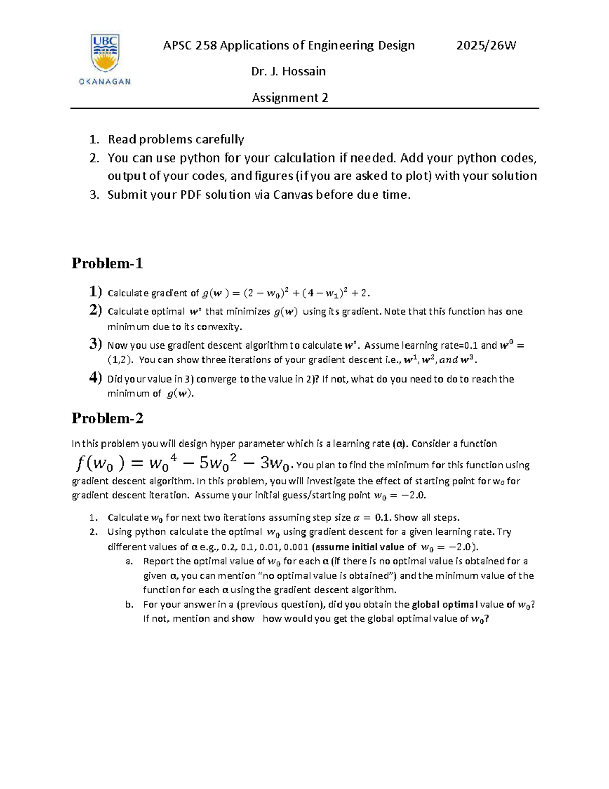 APSC 258 Engineering Design Assignment 2: Gradient Descent & Regression ...