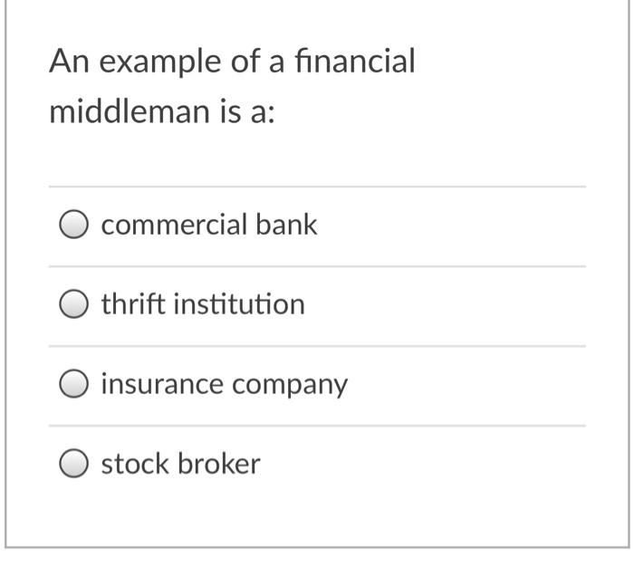 Solved An example of a financial middleman is a: commercial | Chegg.com