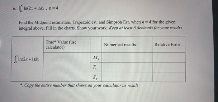 Solved 6. [in(2x+1]dx , n = 4 Find the Midpoint estimation, | Chegg.com