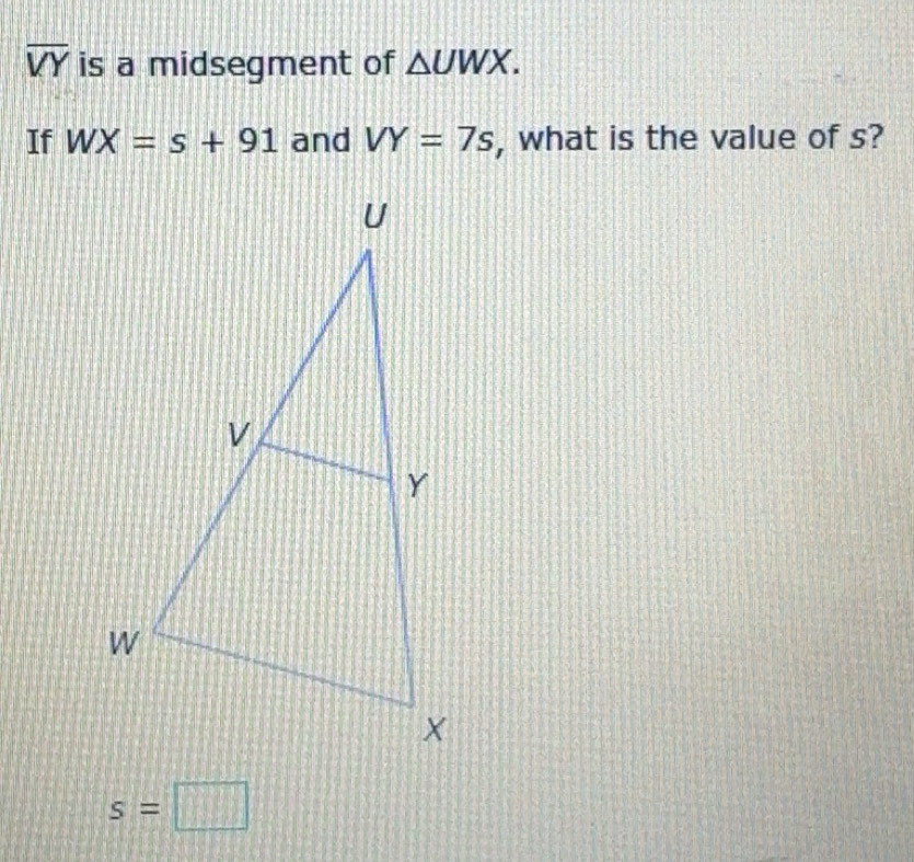 Solved: overline VY is a midsegment of UWX. If WX=s+91 and VY=7s , what ...