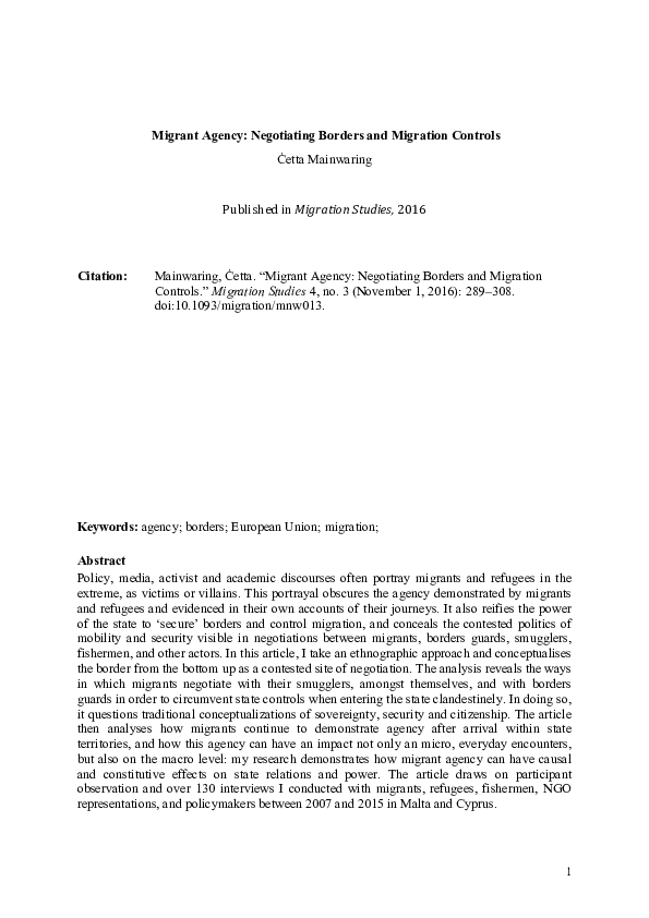 (PDF) Migrant Agency: Negotiating Borders and Migration Controls