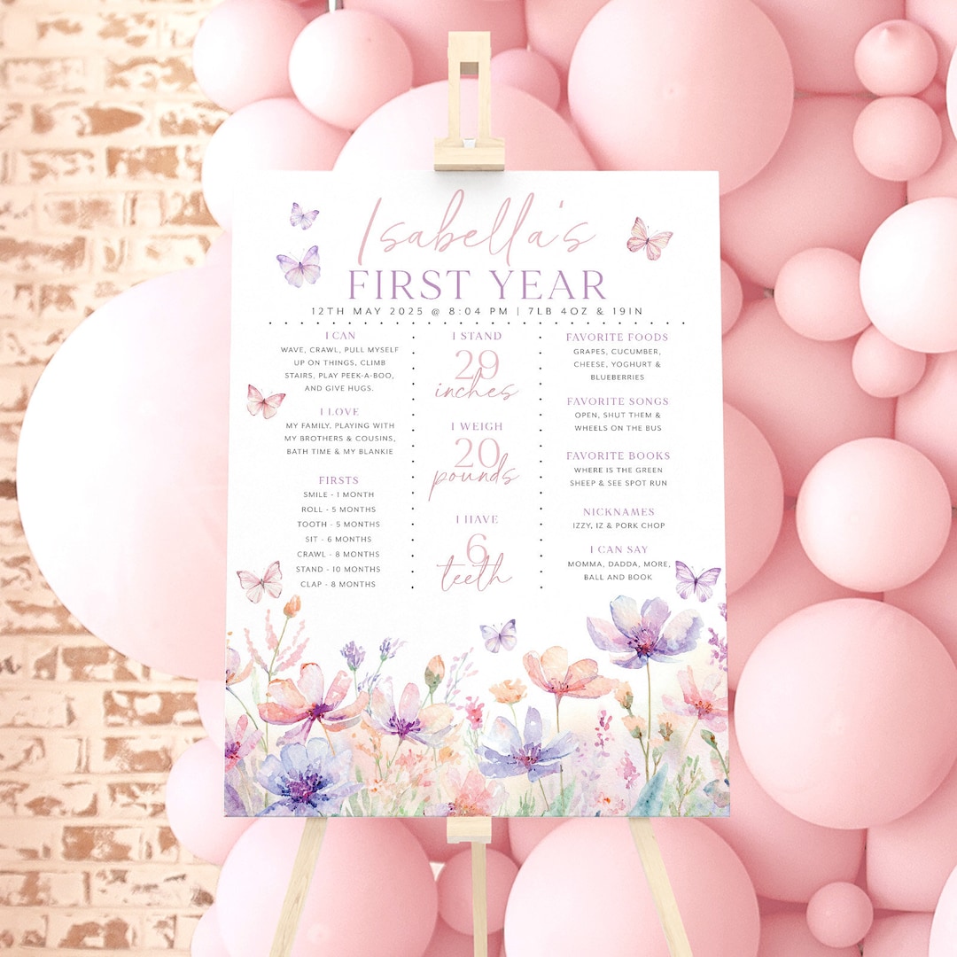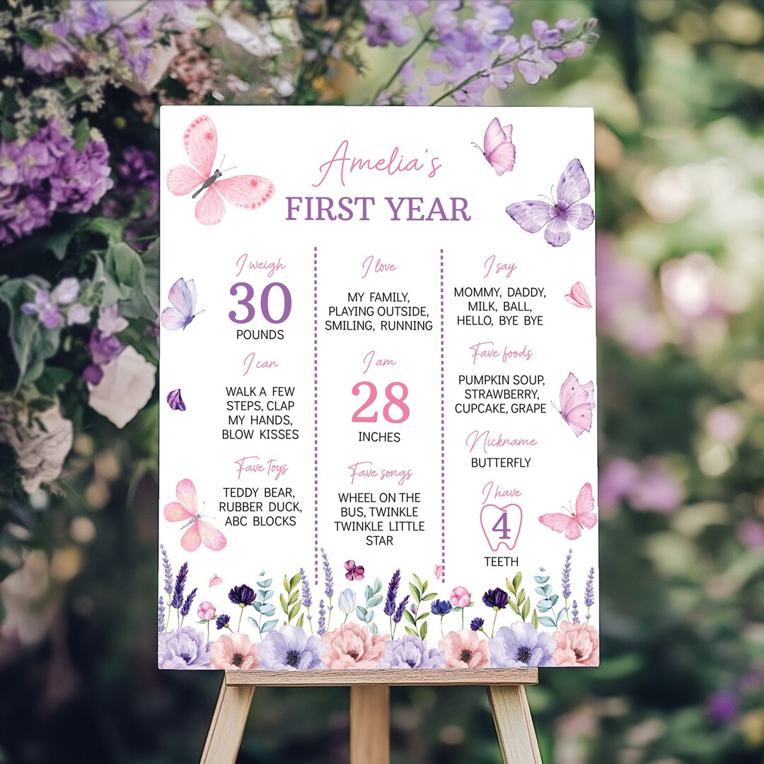 First Birthday Milestone Board Template, Pink Purple Butterfly ...