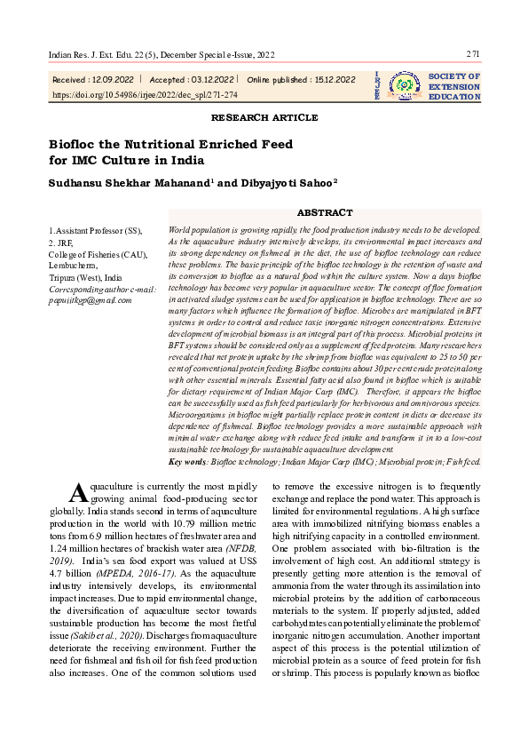 (PDF) Biofloc the Nutritional Enriched Feed for IMC Culture in India