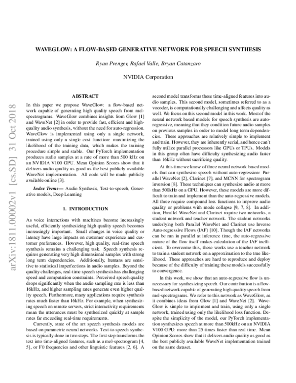 (PDF) Waveglow: A Flow-based Generative Network for Speech Synthesis