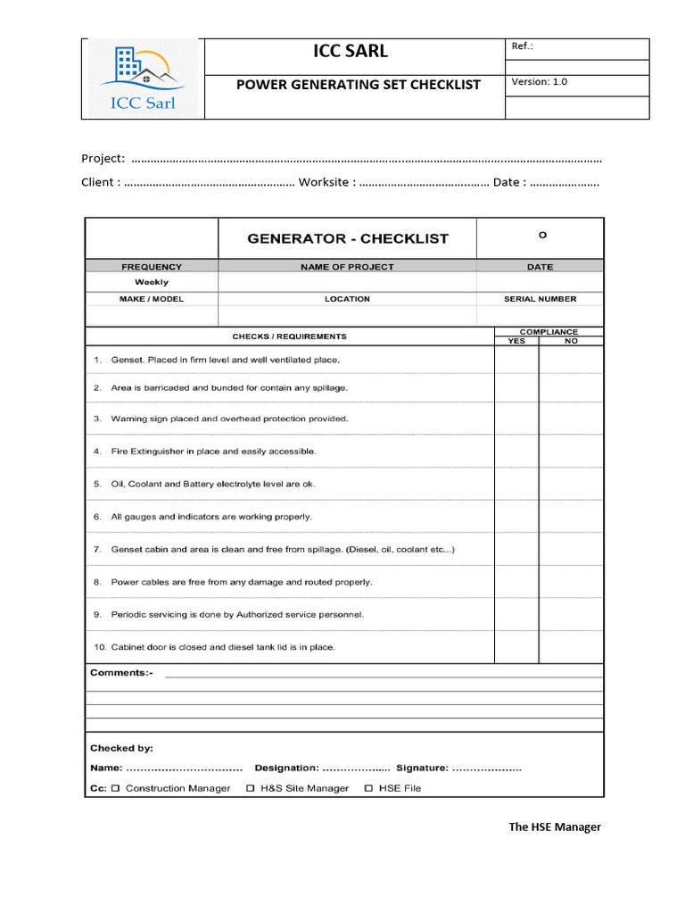 HSE DOCUMENTS-INSTALLATION CHECKLIST FOR GENERATOR - HSE Documents