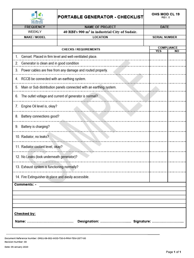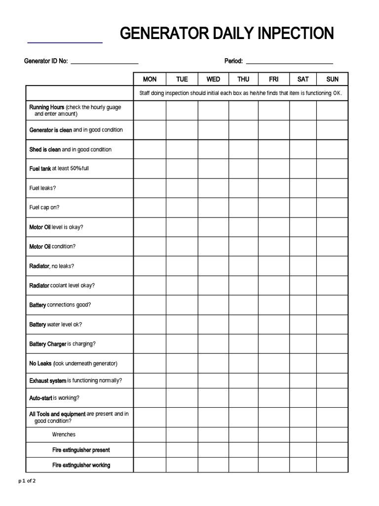 Generator Inspection Checklist - Generator Checklist - Power Generator ...