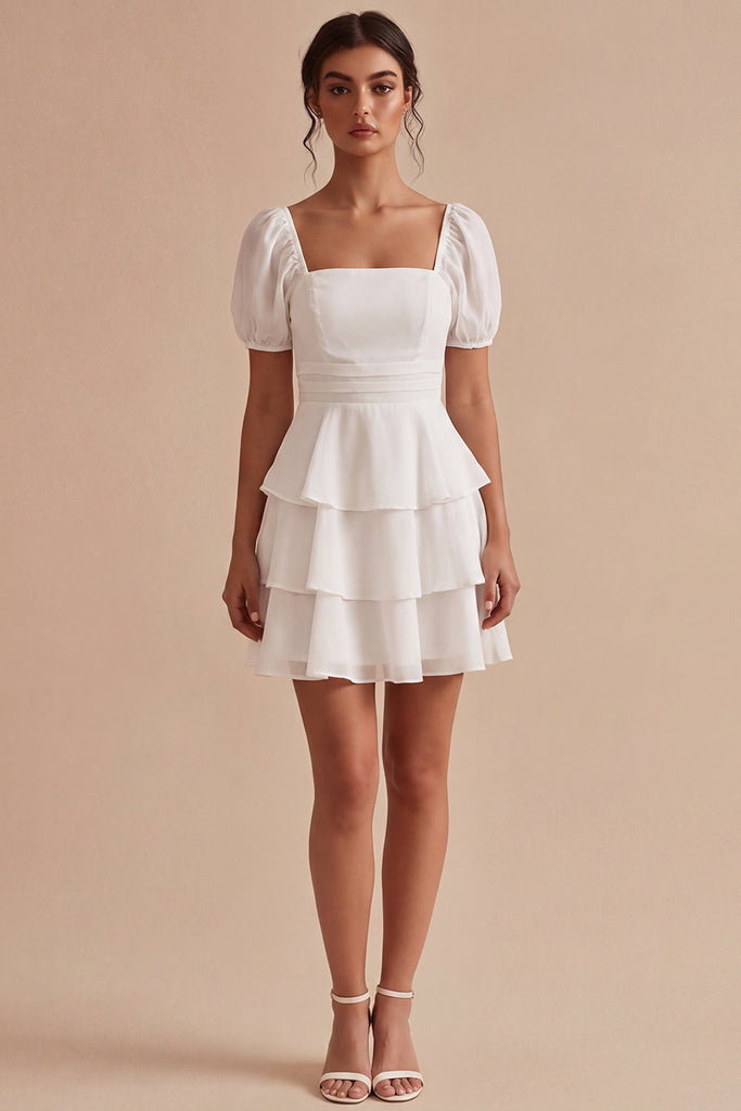 Zapaka Women White A Line Square Neck Mini Dress Tiered Ruffle ...