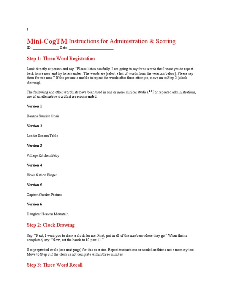 mini cog.pdf - Instructions for Administration & Scoring ID: Date: Step ...