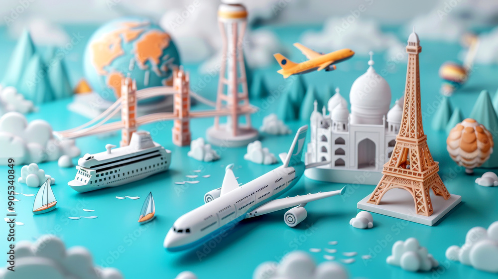Colorful miniature travel scene with famous landmarks, airplane, and ...