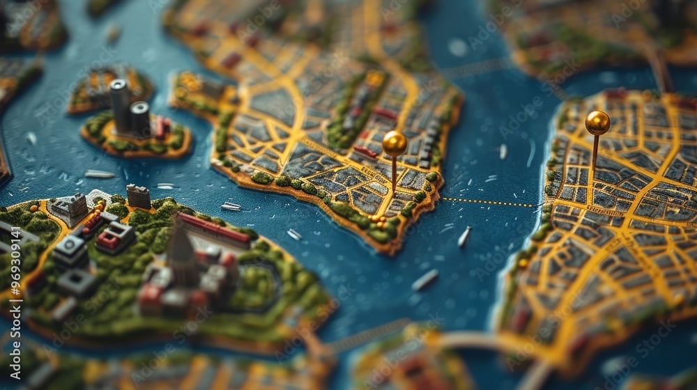 Miniature 3D Model City Map With Pins Marking Destinations On ...