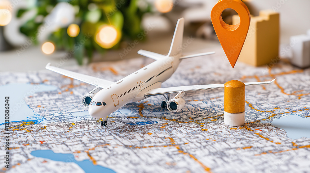 Miniature airplane on a city map showing the destination poi
