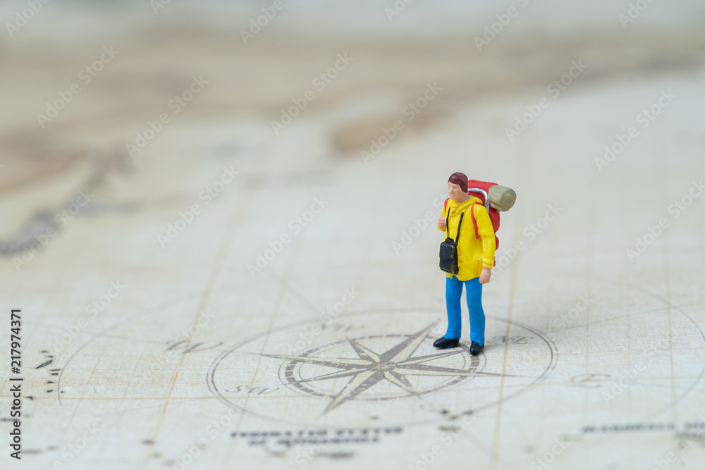 Miniature people, travelers with backpack walking to destination using ...