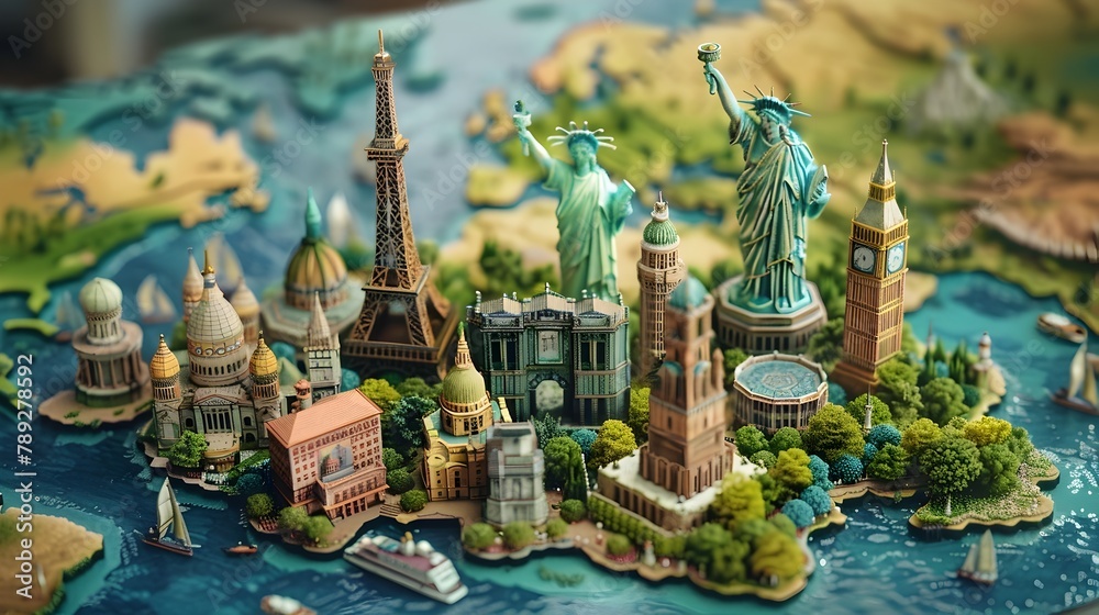 Travel Dreams Miniature Landmarks on a World Map | Premium AI-generated PSD