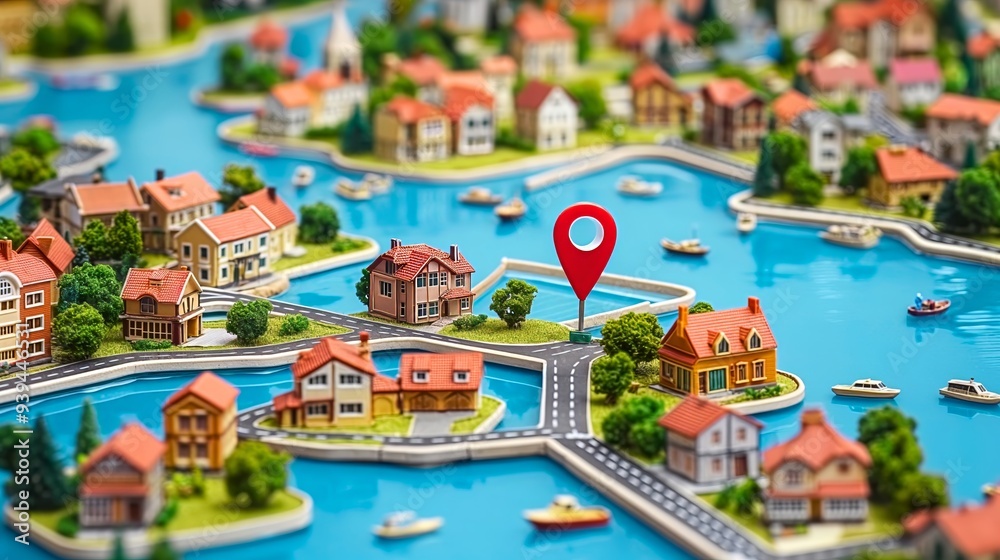 Map of city with miniature houses macro view red pin marking location ...