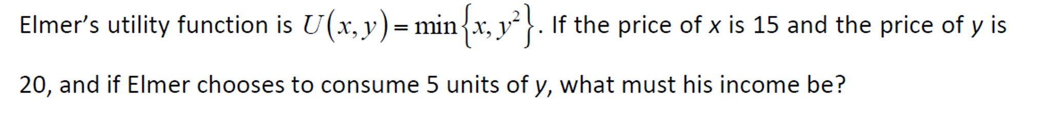 Solved Elmer's utility function is U(x, y) = min{x, y^2}. If | Chegg.com