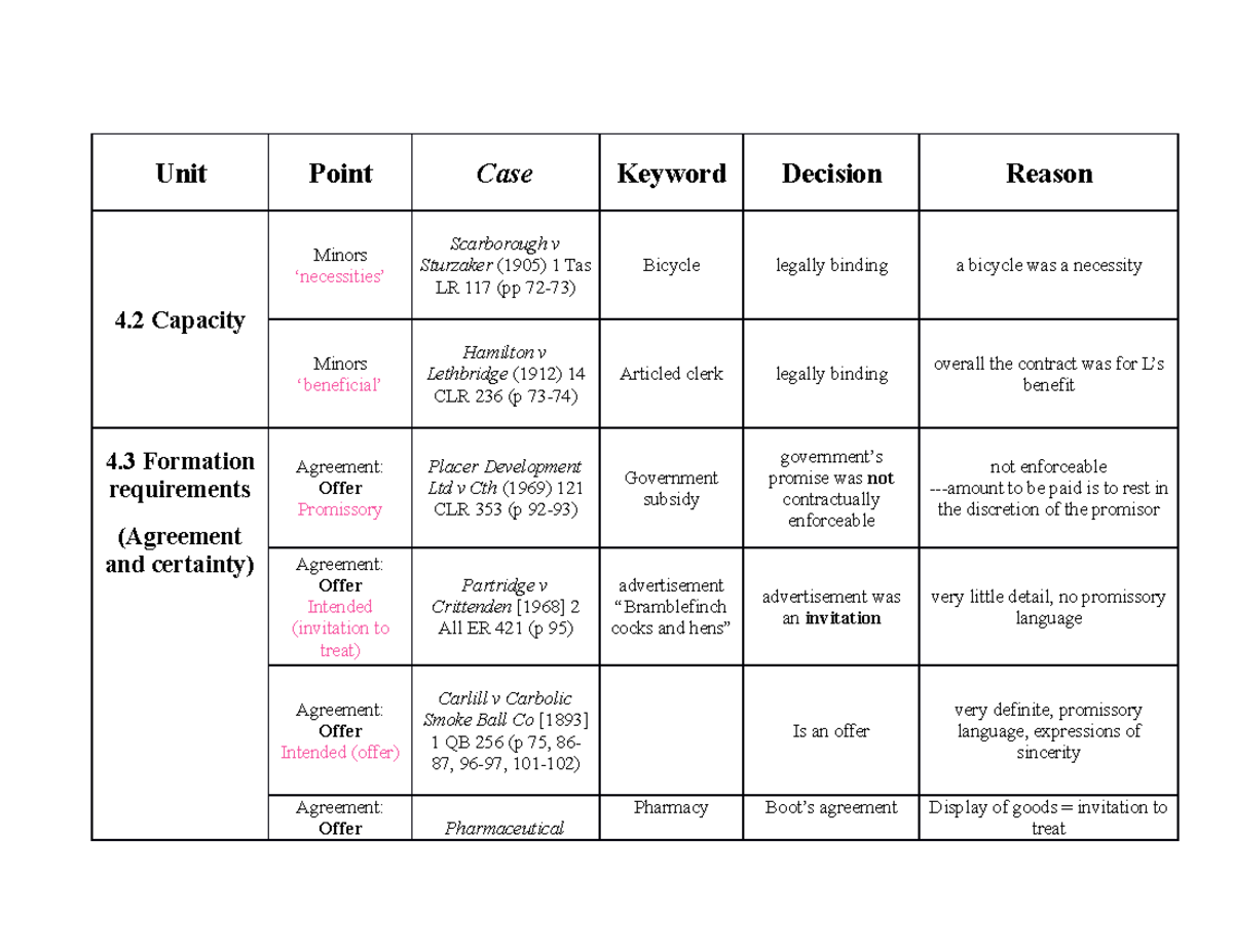 Examinable cases - Unit Point Case Keyword Decision Reason 4 Capacity ...