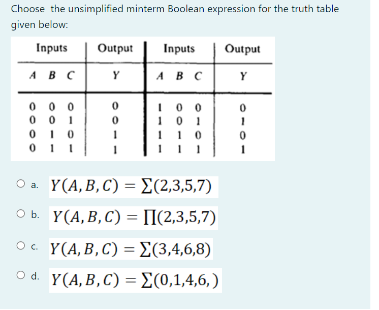Solved Choose the unsimplified minterm Boolean expression | Chegg.com