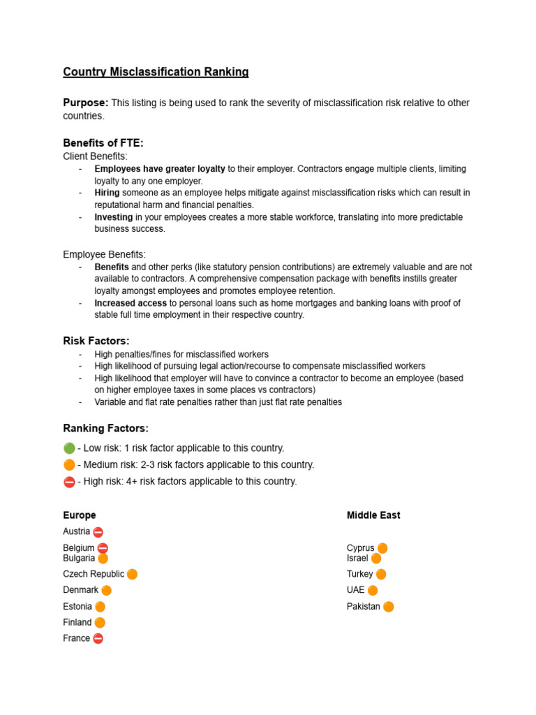 Misclassification Risk by Country | PDF | Employment | Employee Benefits