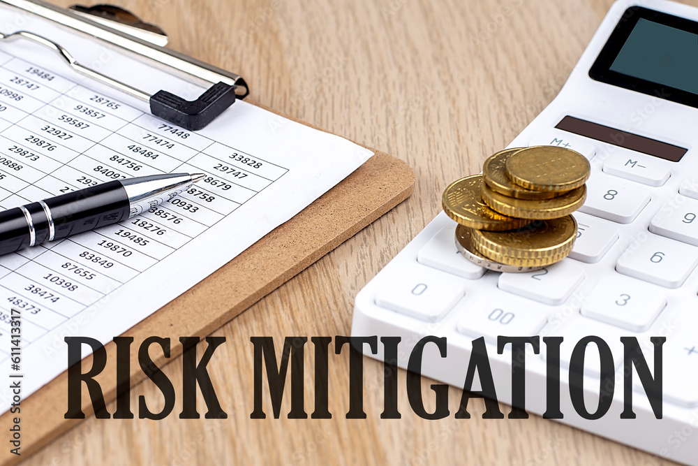 RISK MITIGATION text with chart and calculator and coins , business ...